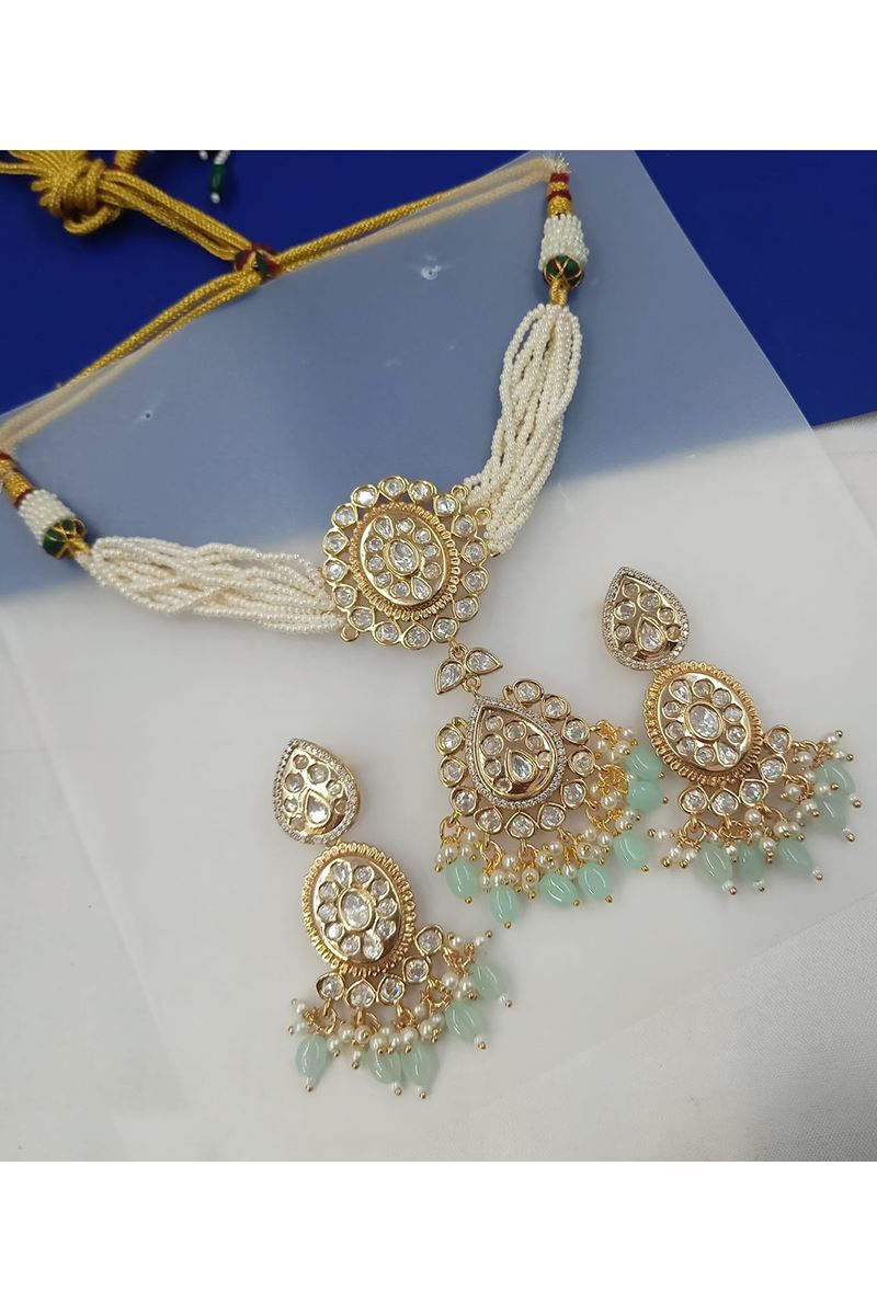 Get praised for your beauty and charm with this heavenly gold plated, White and Sky Blue colored alloy designer choker set beautifully crafted with Kundan and Moti Work. Collection of this complete set which includes 1 Choker Necklace and 1 Pair of Earrings. Note. Please note that shipping charges will be applicable for accessories if it is bought along with any product under the following categories-Sarees/Lehengas/Kurtis/Gowns, etc. If you buy only accessories, then additional shipping charges will apply.