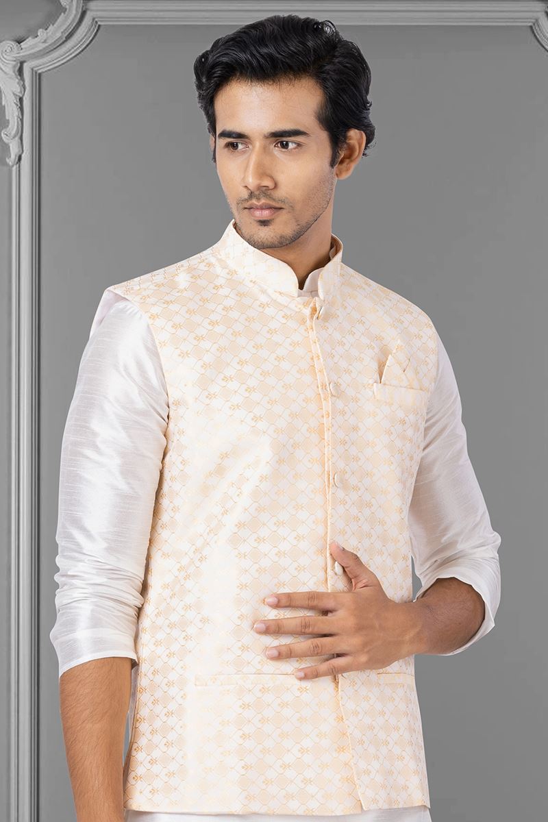 Get ready to look stylish in this Peach Colored Designer Jacket. This Jacket is made from Jacquard Silk fabric and is adorned with Zari work. Team it with brooch and mojaris to elevate your style. Note: Color may slightly vary due to digital photography.