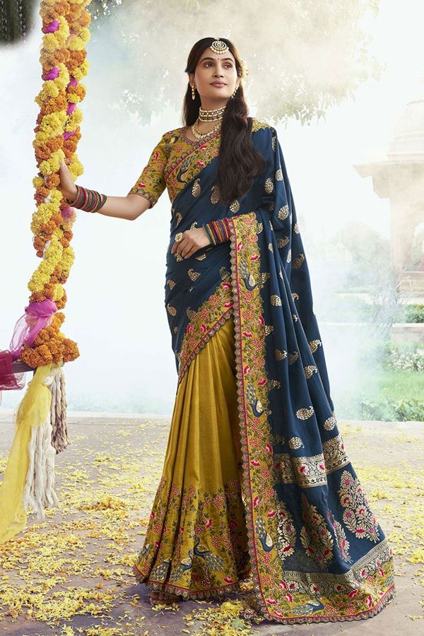 Boost your fashion style with this alluring Mustard and Prussian Blue colored designer saree. Buy this saree which is made of Silk fabric and is beautifully crafted with Weaving and Heavy Embroidery with Lace Border Work. Pair this saree with ethnic jewellery and a pair of heels to elevate your style. This saree comes with a Mustard colored, Silk blouse fabric. Note slight color variation may be possible due to the digital photography. Accessories shown in the image is for photography purpose.