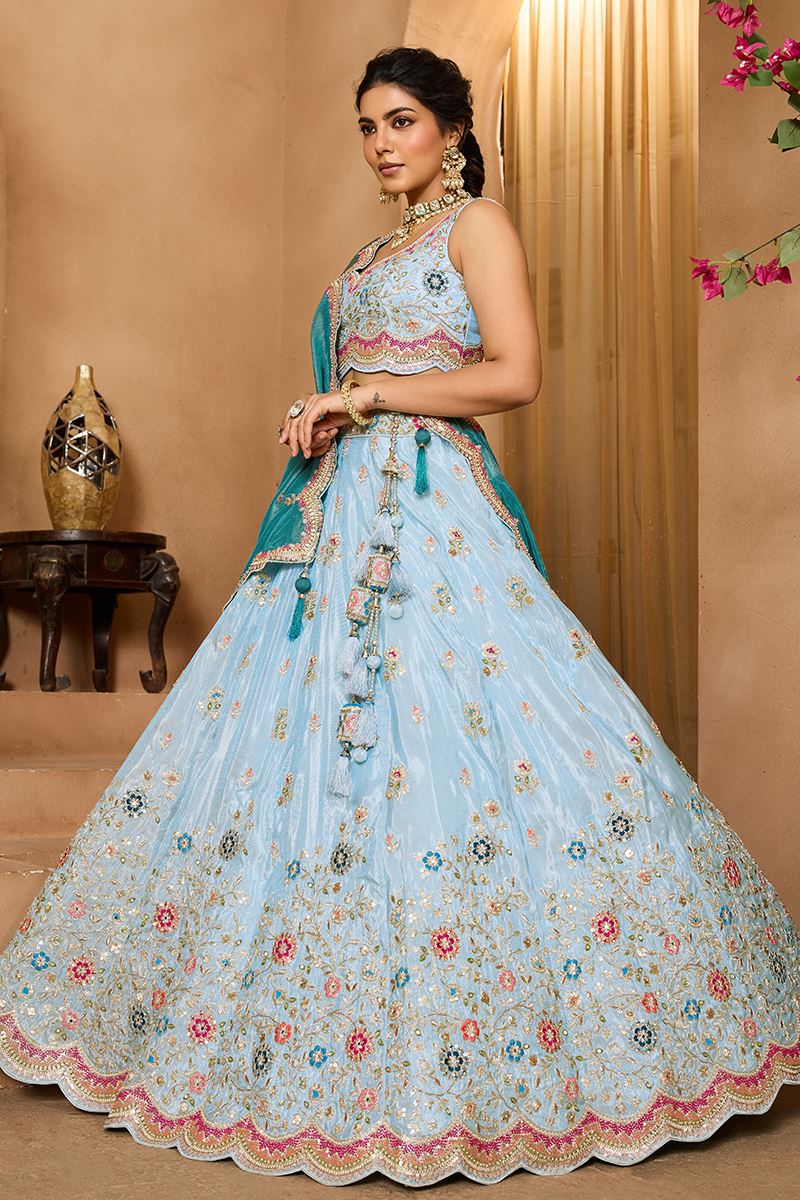 Wear the gracefulTurquoise Blue colored Designer Indo-Western Lehenga Choli. Buy this lehenga choli crafted from Tissue fabric embellished with Beads, Stone, and Coding Work. Has a Thread Embroidery Work. Has a Thread Cut Work Border on the Hemline. The lehenga has a double shantoon inner with 2 layers of can can 12 and 18 inches with Buckram 4 and 12 inches. The latkan adds a charm to the lehenga composed of hand-made round-shaped tassel, with ethnic work hanging beads latkan. The flare of the lehenga is 4.2 meters and the length is 42 inches. The waist and the bust of the lehenga and choli are customizable up to 40 and 42 inches. Complete your look with ethnic jewelry and heels. The ensemble includes a Teal colored, Tissue fabric dupatta embellished with sequin ethnic motif with an embroidery border work. The length of the dupatta is 2.5 meters and the width is 1 meter. Please note that color variations may occur due to digital photography, and the accessories shown are for illustrative purposes only.