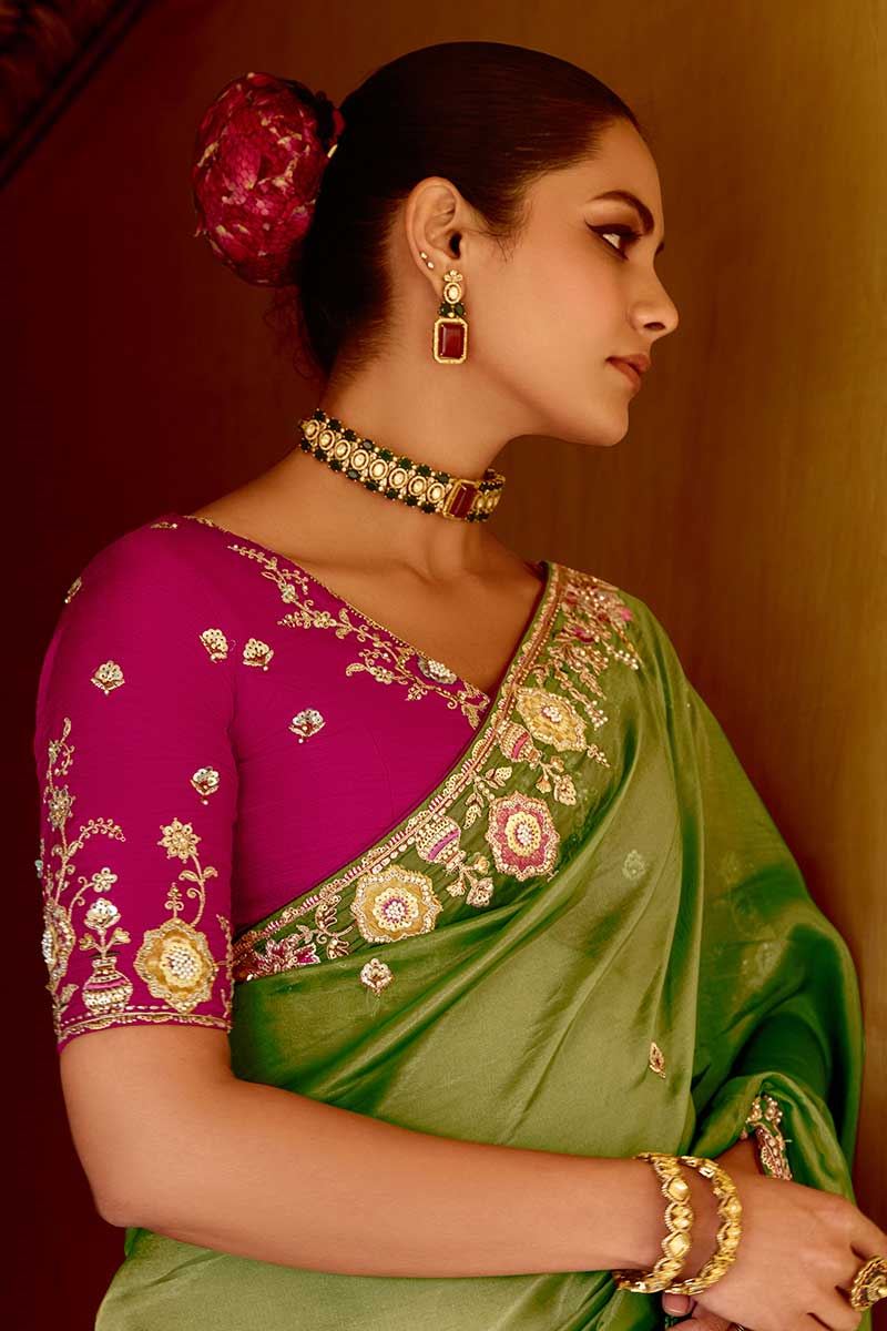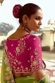 Look for a way to diversify your attire for the day? Then go ahead and wear this alluring Parrot Green colored designer saree. Shop online for this saree which is made of Pure Silk fabric and is beautifully crafted with Heavy Sequin, Thread Embroidery with Stone and Lace Border Work. Pair this saree with ethnic jewellery and a pair of heels to elevate your style. This saree comes with Pink colored, Pure Silk blouse fabric. Note slight color variation may be possible due to the digital photography. Accessories shown in the image is for photography purpose.