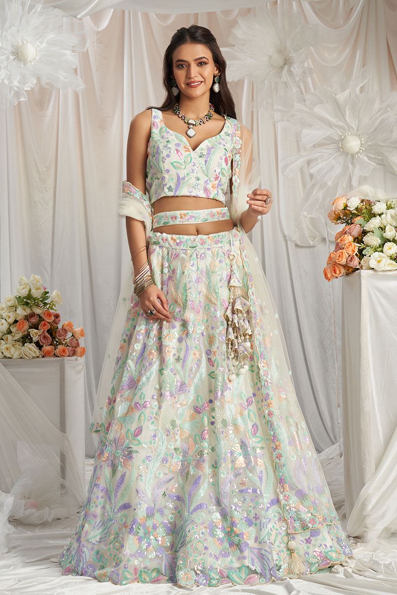 Wear the graceful cream designer indo-western lehenga choli. Buy this lehenga choli crafted from net fabric and embellished with multi color sequin, and intricate coding thread embroidery. The hemline features a thread cut work border for added elegance. Both the lehenga and choli are customizable to fit waist and bust measurements up to 38 inches. The lehenga boasts a 3.5-meter flare, a double shantoon inner, and layers of Can Can (17 and 10 inches) along with 9- and 5-inch buckram for structure. The blouse with a sweetheart neckline adorned with sequin, and thread embroidery work. The waist belt (27 inches) of the lehenga is enhanced with sequin embroidery and features elegant tassels attached to the drawstring. The latkan adds a touch of charm with its handcrafted round tassel and ethnic beadwork latkan, beautifully complementing the lehenga. Complete your look with ethnic jewelry and heels. The ensemble includes a matching, net dupatta featuring Sequin Ethnic Motif with Embroidery Border Work with attached latkan. The dupatta measures 2.5 meters in length and 1 meter in width. Please note that color variations may occur due to digital photography, and the accessories shown are for illustrative purposes only.