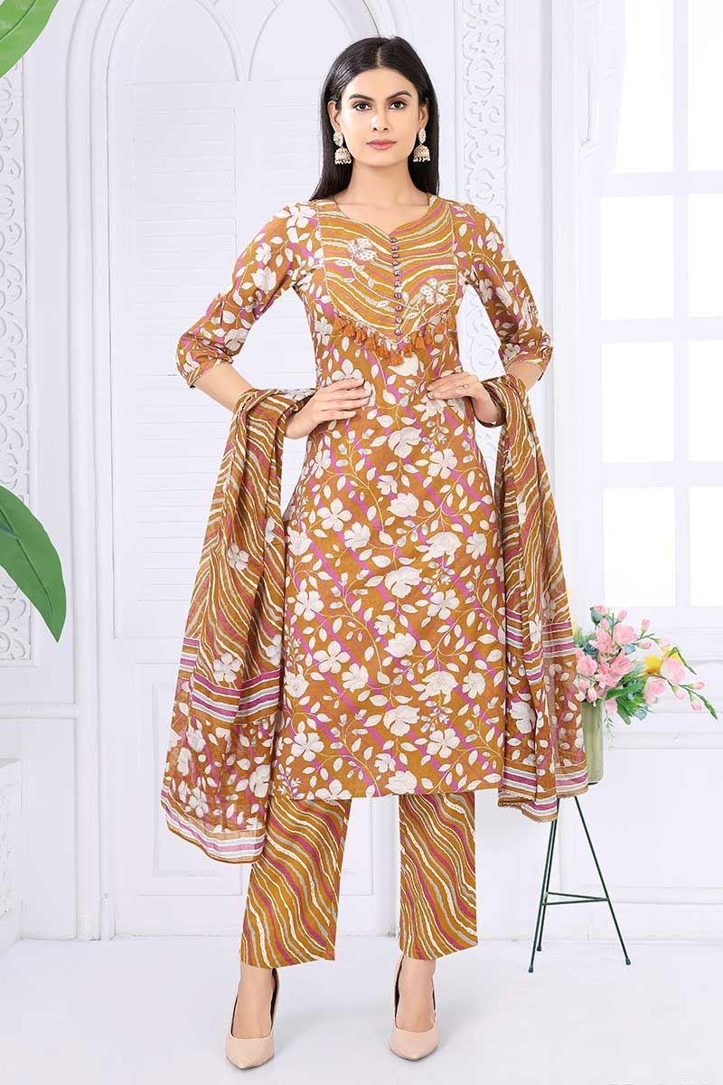 Update your clothing style as per the latest trend with this beautiful Brown designer straight cut suit. Order this suit crafted from Viscose Rayon fabric, which features Floral Printed and Embroidery Work. Enhance your ensemble with ethnic jewelry and a pair of heels for a sophisticated touch. The suit is paired with a matching dupatta and bottom, both featuring printed work. The bottom is made up from Viscose Rayon fabric wherein dupatta is made from Poly Chiffon fabric. Please be aware that slight color variations may occur due to digital photography, and the accessories shown are only for illustration.