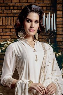 Update your clothing style as per the latest trend with this beautiful Ivory colored designer Anarkali suit. Shop online for this suit which is made of Dola Silk fabric and is beautifully crafted with Thread Work. Pair this suit with ethnic jewellery and a pair of heels to elevate your style. This suit comes with a matching bottom and dupatta made from Chinon fabric. Note slight color variation may be possible due to the digital photography. Accessories shown in the image is for photography purpose.